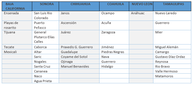 Para efectos del presente Decreto, la zona fronteriza norte está conformada por los siguientes municipios: